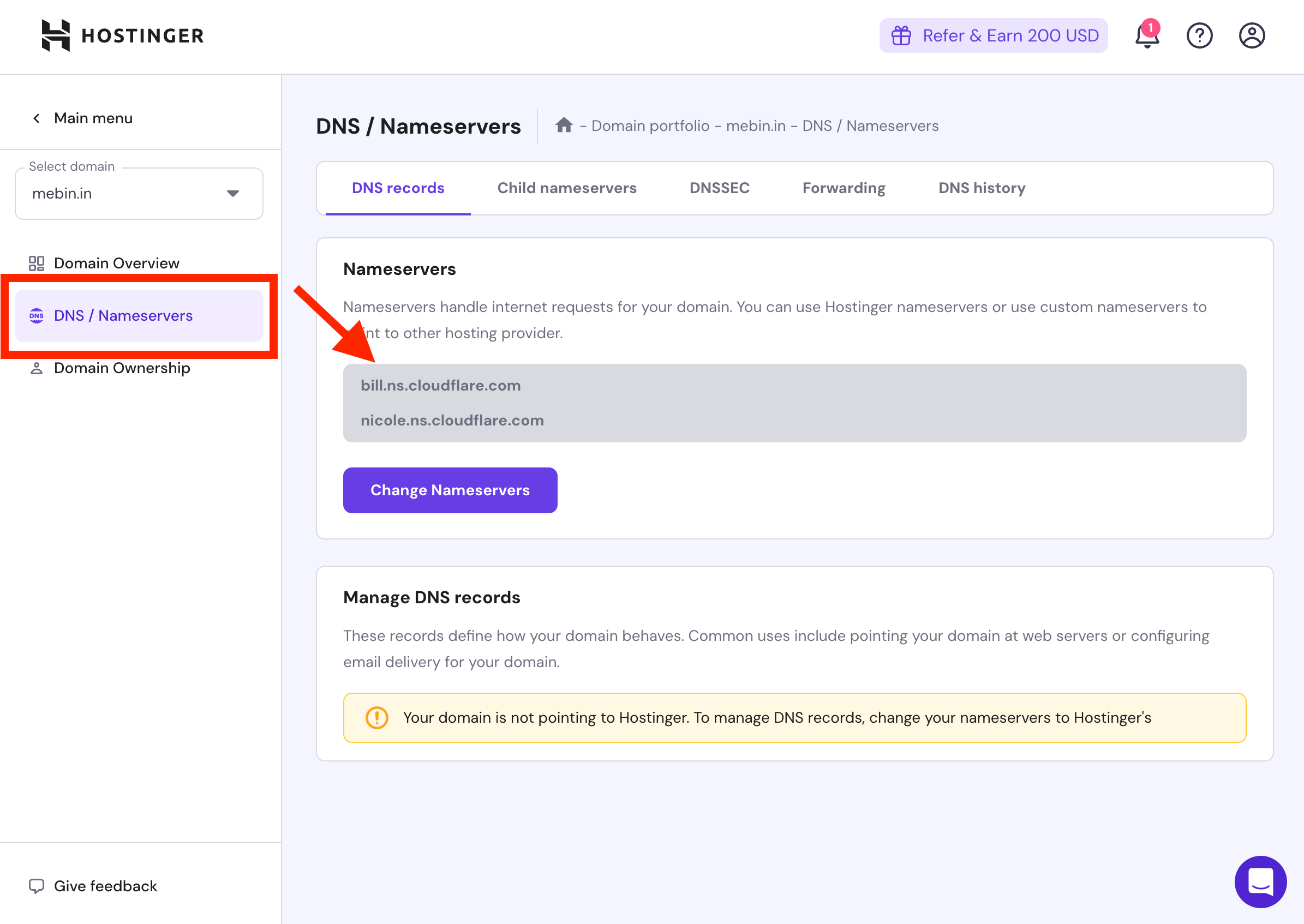 To change the name servers, go to the provider who you got the domain from and change the name servers. In my case I got the website from hostinger, so I shall change my nameservers from hostinger to cloudflare.