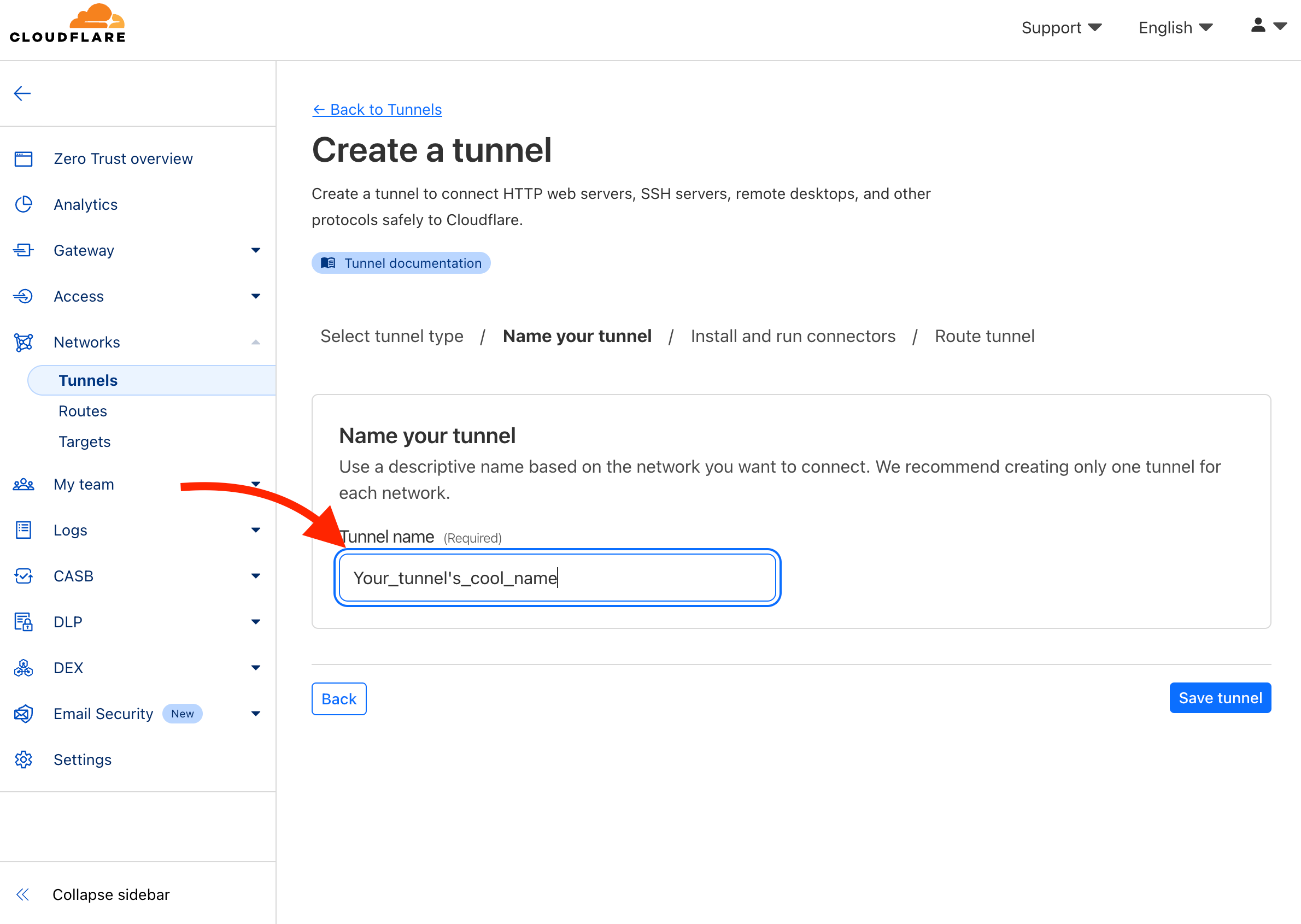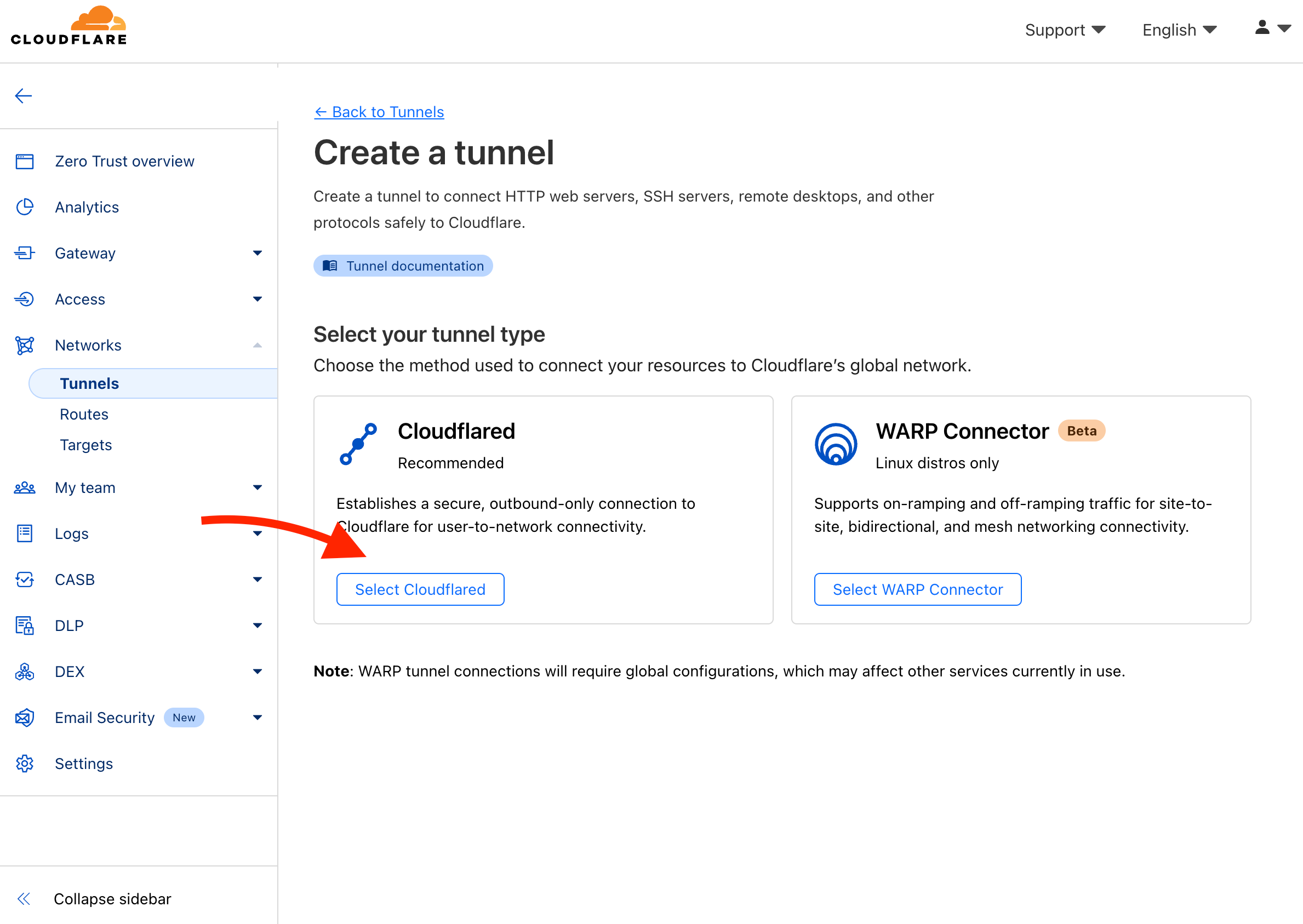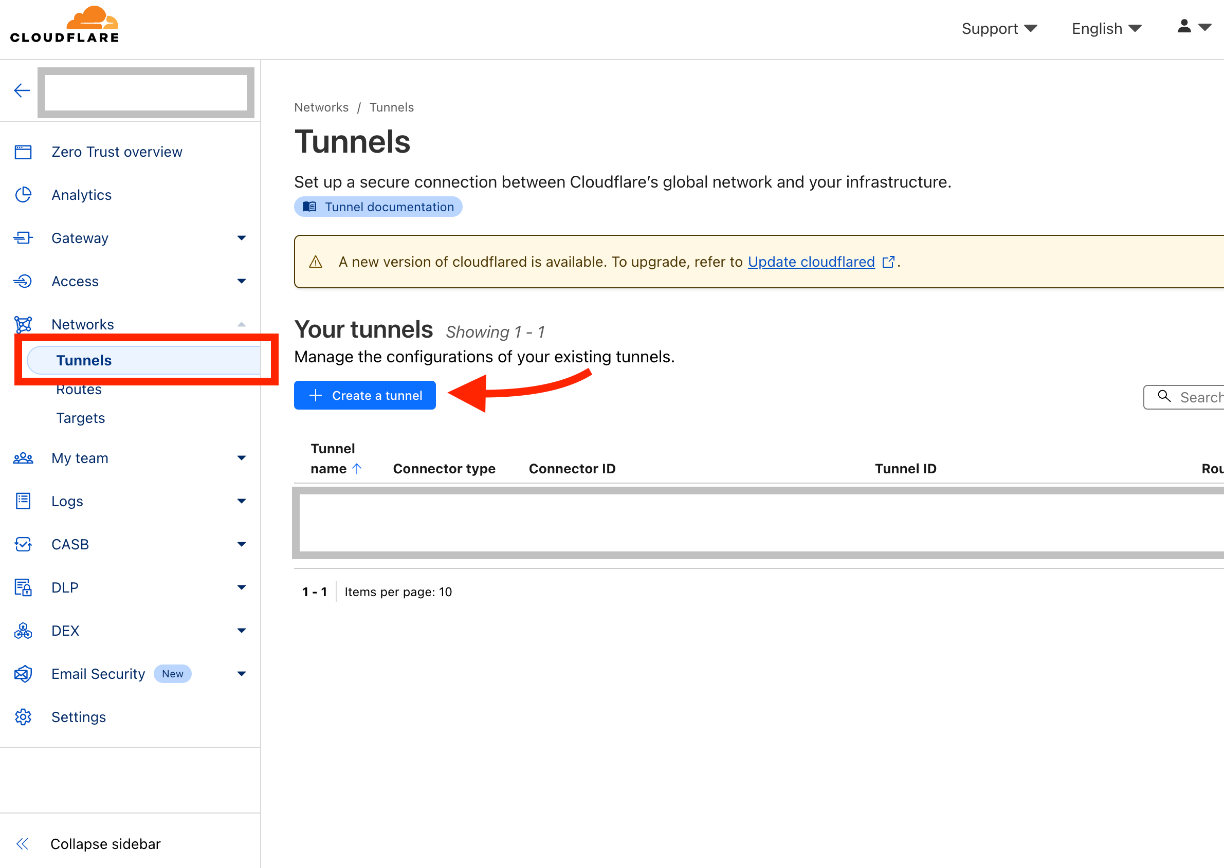 After that head over to the "Zero Trust" section in the left hand side. Once you open the zero trust panel, you should be able to navigate to the tunnels section which is under the "Networks" tab and create a new tunnel like so: